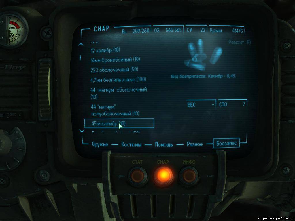 - В игру возвращены абсолютно все боеприпасы из "Fallout 2", все 24 разновидности. Патроны из "Fallout tactics" в мод не включены, по крайней мере на данной стадии. - Для всех типов патронов использованы свои, уникальные модели. Часть из них использована из ресурсов игры (стандартные модели коробок), часть - создана с нуля по иконкам из "Fallout 2". Всего новых моделей в моде 9 штук: - 4,7 безгильзовые - иглы 2мм (патроны к гауссу) - шарики для пневматики - иглы для иглострела / иглы для иглострела бронебойные - топливо для огнемёта / топливо для огнемёта МК II - разрывная ракета - бронебойная ракета - малая батарея - ядерный микрореактор. - Для всех типов патронов сделаны уникальные текстуры и новые иконки для пип-боя с описаниями, взятыми из "Fallout 2". Сами иконки взяты оттуда же, восстановлены и доработаны - любители классики, думаю, оценят. - Все дефолтные боеприпасы заменены на новые - охотничье ружьё стреляет патронами 223FMJ, Китайский пистолет - 9мм патронами и так далее. Остались только боеприпасы для самодельного оружия, энергоячейка чужих, батарея для гипнотрона и ядерная минибомба от толстяка, но и для них сделаны новые иконки. - Если оружие может использовать два типа патронов (например, 10мм пистолет в "Fallout 2" использовал полуоболочечные и бронебойные патроны) - то при его экипировке вам будет предложено выбрать тип используемых боеприпасов. В зависимости от этого варьируется и урон, наносимый оружием. - Изменения патронов не могли не изменить и оружие. Теперь для каждого типа патронов есть соответствующие гильзы. При стрельбе из затворной рамы вылетают гильзы от того вида патронов, который вы используете: пистолетные, винтовочные, автоматные или от дроби - всего 9 разных типов - Аналогично для каждого типа патронов есть соответствующий "эффект летящей пули", который мы можем увидеть при стрельбе в режиме VATS - всего 9 разных типов. - Все новые типы боеприпасов добавлены в лут-листы и левел-листы. Они часто встречаются у неписей, рейдеров, наёмников компании "Коготь", изгоев и т.д. Разумеется, если рейдер напал на вас с китайским пистолетом, то на его остывающей тушке вы вряд ли найдёте какие-то патроны, кроме 9мм или 9мм "Люгер" - боеприпасы противникам расписаны соответственно используемого ими оружия. - Частоту, с которой попадаются новые боеприпасы, я постарался оставить на примерном уровне "Fallout 2" (то есть патроны для гаусса, например, придётся изрядно поискать), но всё-таки с поправкой на арсенал "Fallout 3". - Так же новые патроны распределены по всему игровому миру - в локациях, на Пустоши, в ящиках и т.д. Всего в игре около 1000 новых объектов расставлено вручную. Так же созданы новые ящики с боеприпасами для новых типов патронов. - От нечего делать произведена лёгкая корректировка баланса оружия. Если раньше на маленьких уровнях вы бегали только с 10мм пистолетом, потому что бегать с китайским или револьвером 32 калибра было сродни самоубийству - то теперь есть из чего выбрать. Например: пистолет 10мм с патронами JHP наносит урон 7 ед, с патронами АР - 8 ед. Китайский пистолет с патронами 9мм - 6 ед., с патронами "Люгер" - 8-9 ед., но они не так часто попадаются. Револьвер 32 (теперь он револьвер 45) вышибает 10-11, но зато быстро приходит в негодность. Таким образом, каждый может бегать с тем, что ему нравится, но не стоит забывать, что противники с таким оружием стали чуточку опаснее. - Немного изм